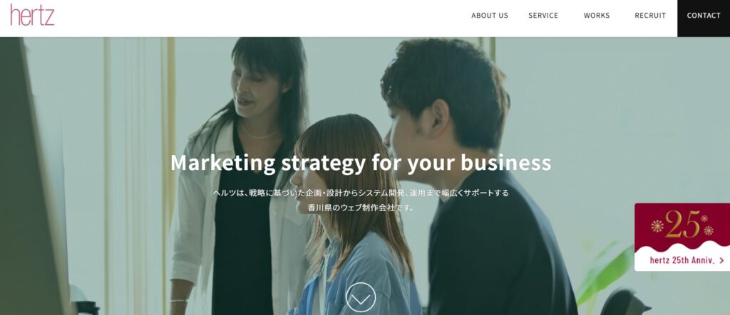 ヘルツは、Webだけで完結しない現実を理解し、ビジネス全体を見据えた戦略的なサイトづくりを行っています。制作前の戦略立案を重視し、成果につながる設計・運用を提案します。技術や情報のアップデートを欠かさず、「◯◯らしさ」に縛られない柔軟な制作体制が特長です。サイトは作って終わりではなく、継続的な運用こそが成功の鍵と考えています。営業担当はおらず、25年間の実績と信頼が次のプロジェクトへとつながっています。